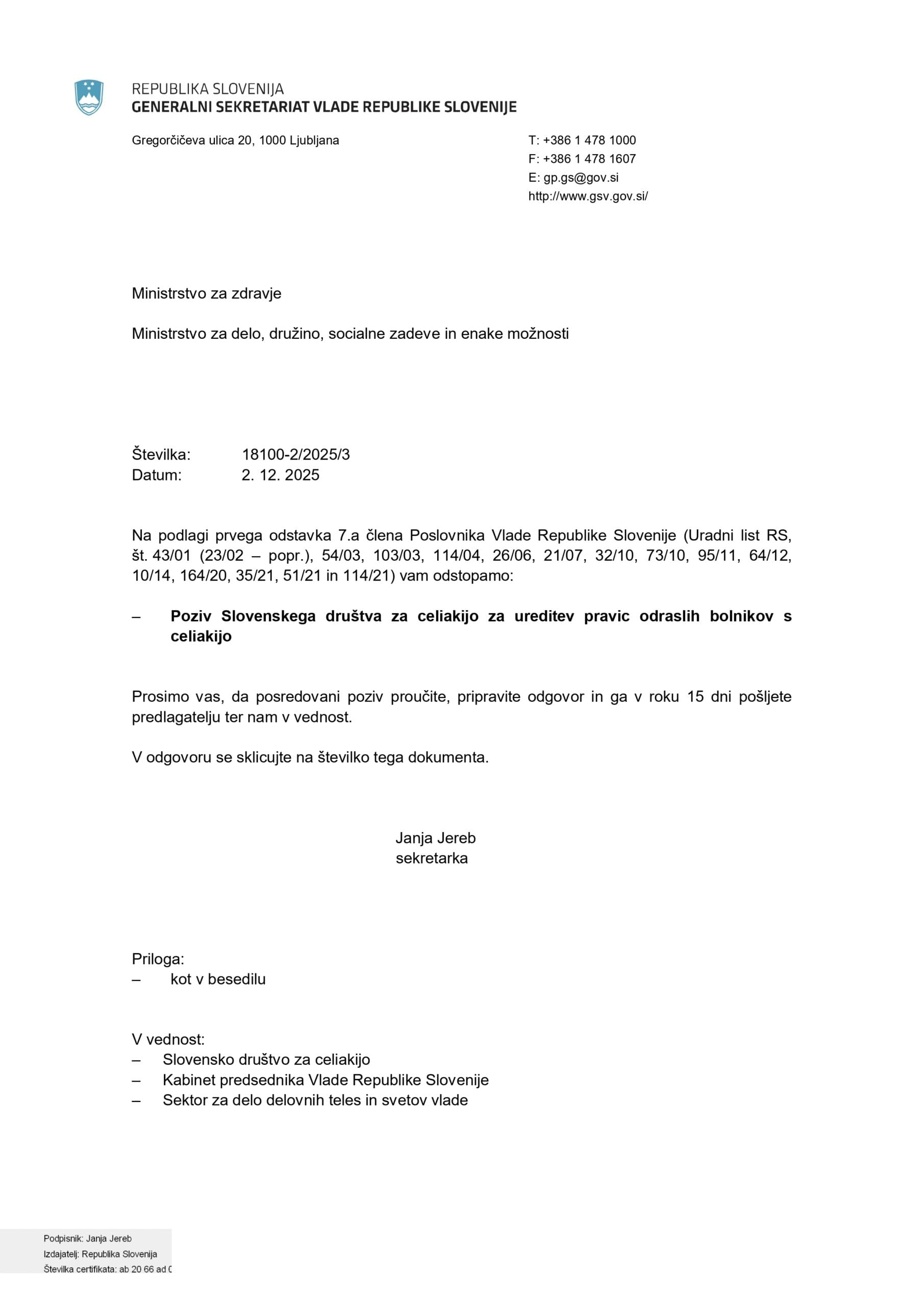 Po tem, ko smo 30.11.2025, na predsednico republike, predsednika vlade, ministrice in ministre, poslanke in poslance, varuha človekovih pravic in zagovornika načela enakosti ter v vednost medijem, poslali poziv za ureditev pravic odraslih bolnikov s celiakijo, smo prejeli prvi odziv.