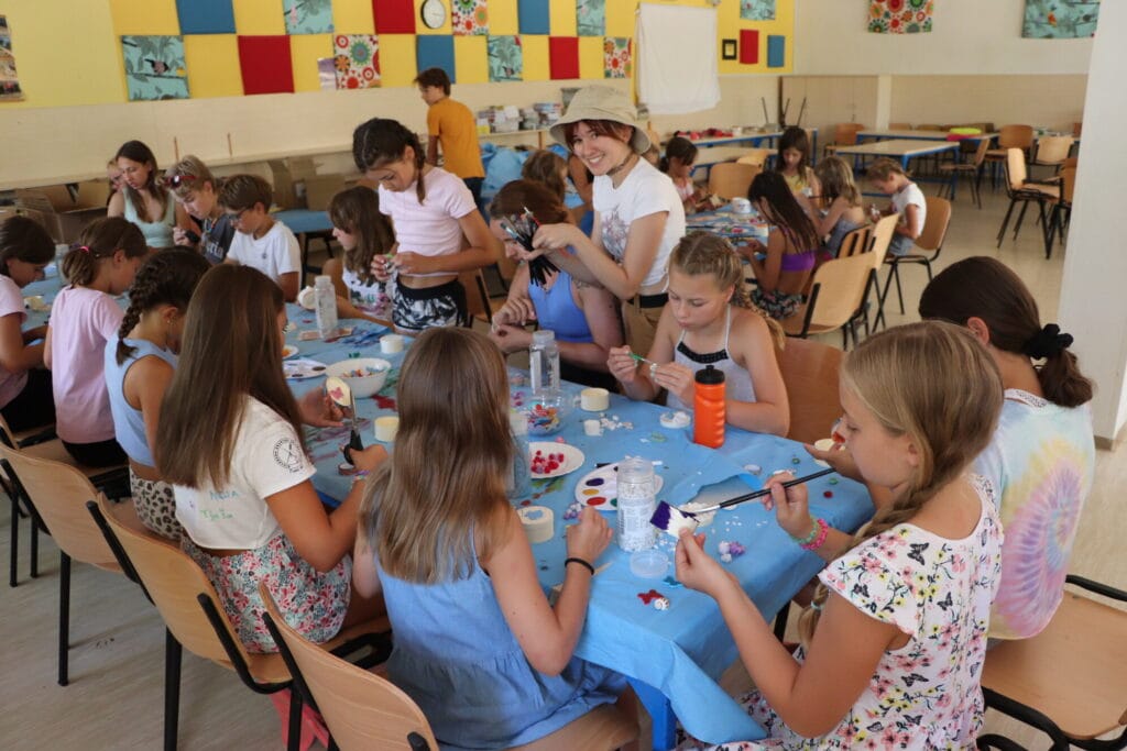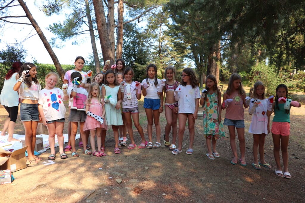 Dan se je začel dobro. Otroci so se spočiti in dobre volje spravili iz postelj in se po jutranjem umivanju odpravili na jutranji sprehod po parku in zatem na zajtrk. Prav zabavno jih je bilo opazovati, kako so mlajši med seboj čebljali, no, starejši pa so se pogovarjali. Zajtrk. Paštetke, maslo, marmeladke, nutela in kosmiči z mlekom ali jogurtom so jim šli dobro v slast. Po zajtrku so imeli nekaj časa, ki so si ga oblikovali po svoje, temu pa je sledila delavnica, na kateri so barvali t-shirte, torej bombažne majice. Vsak zase. Uporabili so različne tehnike in tudi barve za tekstil, od flomastrov, do barv s čopičem in sprejev. Mlajšim, zlasti deklicam, se pozna, da bolj pogrešajo dom, na majicah so to ponazarjale z veliko čustvenejšimi motivi, fantje pa so se odločali za bolj njim lastne abstraktno-umetniške stvaritve. Veliko poslikav je bilo zares dobrih! Po delavnici smo dali majice sušiti, mi pa smo se za slabi dve uri odpravili na bazen. Kaj pa smo danes jedli za kosilo? Nedeljska goveja juhica z zakuho, pa riž z grahom, pečen piščanec in solata! Večina je pohvalila kosilo, prvič smo koga opazili tudi iti po »repete«. Popoldan so otroci imeli dve opciji; ena je bila delavnica, kjer so izdelovali »lovilce sanj«, druga je bila plaža. Presenetljivo veliko otrok se je odločilo za igro z materiali, kjer so izdelali lovilce sanj. Upamo, da bodo fotografije dovolj nazorno predstavile njihove izdelke! Ko smo to zaključili, je do večerje spet bil čas, ki so si ga otroci zapolnili sami s pomočjo vzgojiteljev. To je bil čas za pisanje razglednic in njihovo odpremo v nabiralnik, za pletenje kitk, branje in enostavno klepetanje zunaj, v parku. Večerja – testenine s tuno in solata. In zatem? Juhuhu, talenti!!! Nekaj najbolj pogumnih se nam je odločilo predstaviti svoje talente, pevske, plesne, igralske, vsega po malo. Deležni so bili močne podpore in gromkega aplavza, vsi! Izbrali smo zmagovalca, ampak nihče ni ostal brez nagrade. Po dogodku pa še nekaj disco ritmov in miganja, potem pa umirjanje, branje pravljic, klepet z že ugasnjenimi lučmi in …. spanje… Zzzzz… zzz….zzzz…