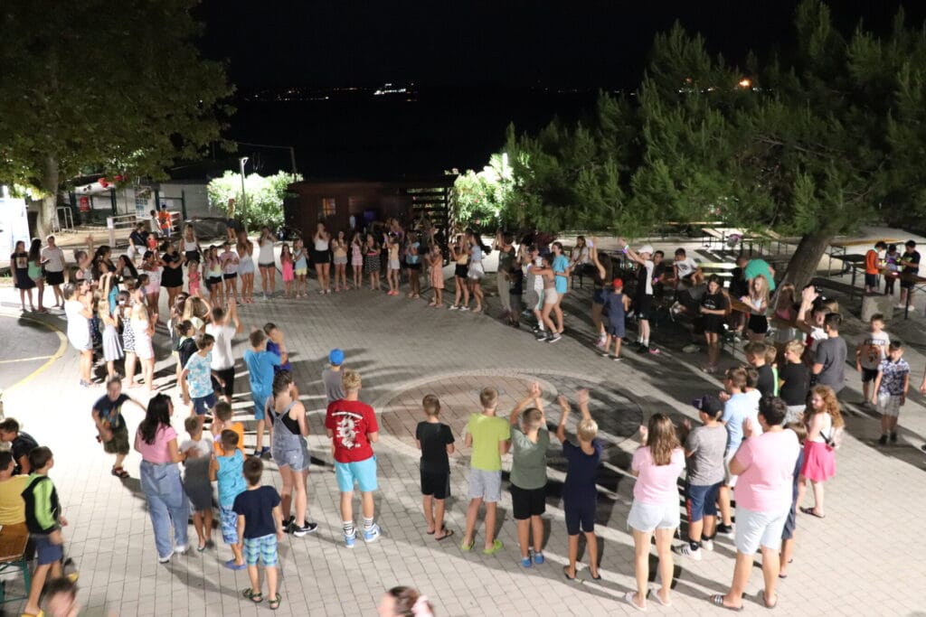 Popoldan smo se zabavali v okolici paviljona, saj ni bilo za vrniti se na plažo, za večerjo pa smo si privoščili rižoto in solato, nakar je v amfiteatru sledila disco noč in veliko plesnih ritmov in zabavnih igric ob glasbi. Utrujeni od prvega dne so otroci po branju večerne pravljice nekaj po 22. uri popadali v postelje…