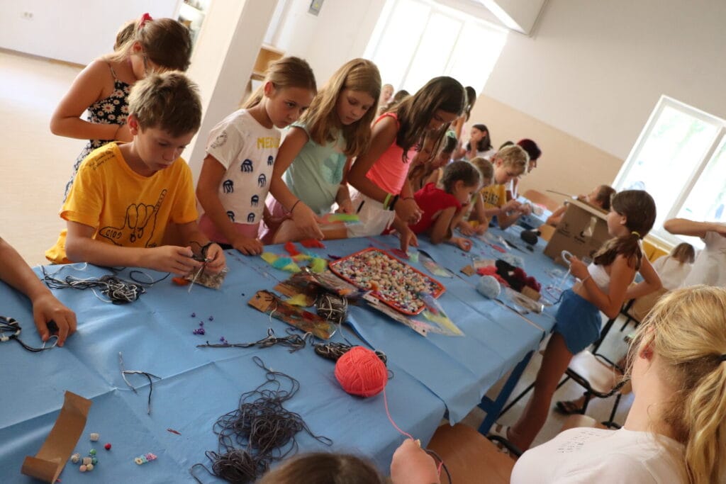 Popoldanski del dneva se je začel s simpatično delavnico, ki je pritegnila predvsem mlajše. Iz doooolgih balončkov smo se učili izdelovati figurice – kužke, mucke, labode,… Zabavno je bilo poslušati pokanje balonov, ki niso zmogli tolikšnega pritiska in opazovati nastajajoče figurice. Medtem, ko so mlajši otroci uživali ob izdelovanju teh figuric, so se starejši zabavali po svoje. Dekleta z veseljem, vsaj nekatera, svoj čas in energijo namenjajo mlajšim… Pletenje kitk, pestovanje, tekanje, igranje skrivalnic… Fantje se bolj posvečajo športnim dejavnostim. Na voljo imajo igranje nogometa, košarke in odbojke. In to kar radi počnejo. Ahhh, seveda, pa poslušanje glasbe. Brez glasbe ni življenja najstnika…