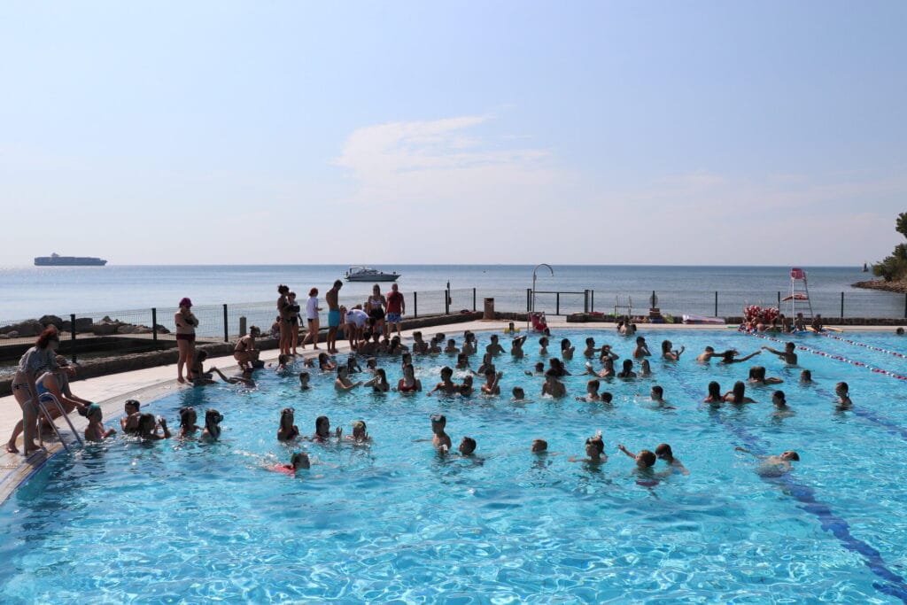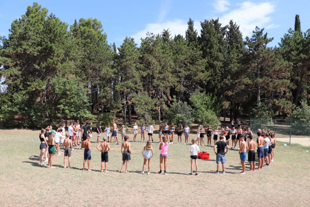 Še eno sončno jutro nas je pričakalo. Nekaj vetriča je premešalo zračne mase in bilo je naravnost super! Sveže. Vstajanje smo zamaknili za 10 minut, kar se je izkazalo kot zelo dobro, saj so vsi otroci pravočasno prišli na jutranjo telovadbo. Kako z veseljem klepetajo med sprehajanjem, mlajši z vzgojitelji, starejši med sabo. Starejši si pri razgibavanju pomagajo tudi z »modrozobnim« zvočnikom in glasbo s telefona, kar je zares super za vse! Tudi na zajtrku nas je pričakalo presenečenje! Nutella, pa salamica in sir, pa jajčka!! Kakšno veselje! Čas po zajtrku je bil namenjen spominom – fotografirali smo se namreč. Vsi, pa vzgojitelji, pa vsaka skupina posebej, pa… resne pa smešne fotke, vsega po malo… Potem pa… – bazen!!! Voda, voda, voda… Čofotanja in smeha ogromno! Pa klepetanja! Pa reševanja Duhcev pri mlajših…