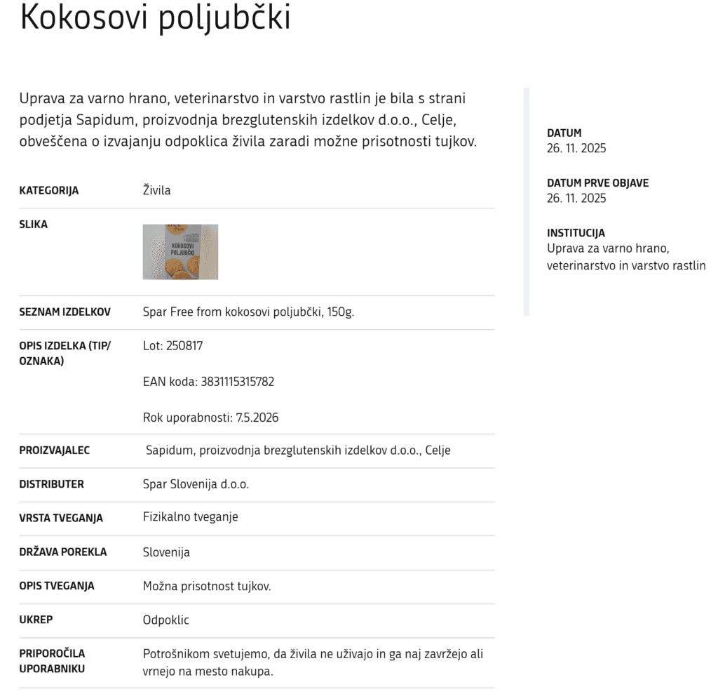 Uprava za varno hrano, veterinarstvo in varstvo rastlin (UVHVVR) je bila s strani podjetja Sapidum, proizvodnja brezglutenskih izdelkov d.o.o., obveščena o izvajanju odpoklica živila “Kokosovi poljubčki” zaradi možne prisotnosti tujkov.