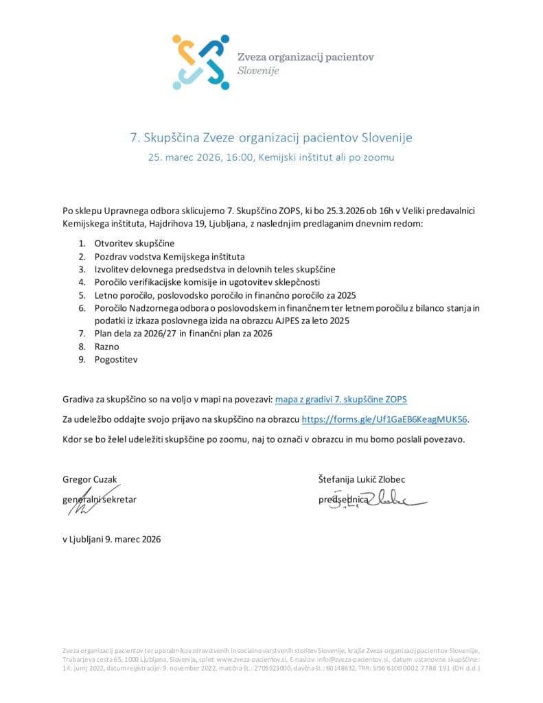 V sredok, 25.3.2026, s pričetkom ob 16. uri, je v Ljubljani potekala že 7. redna skupščina Zveze organizacij pacientov Slovenije (ZOPS).