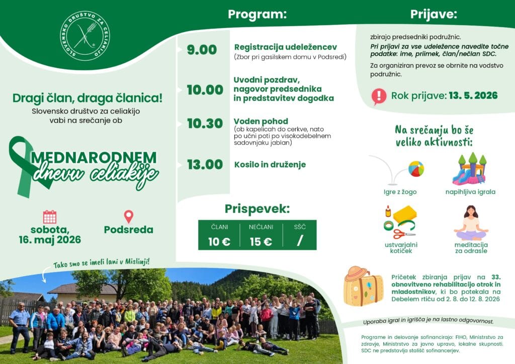 Naslovnica Prispevki [Vabilo – Podsreda, 16.5.2026] Srečanje članov SDC ob mednarodnemu dnevu celiakije24.4.2026 iz Aktivnosti na državni ravni, Aktivnosti na lokalni ravni, Aktivnosti v Celju, Mednarodni dan celiakije, Mesec maj - mesec ozaveščanja o celiakiji Vabilo v formatu .jpg:Vabilo v formatu .pdf:Vabilo Podsreda – MDC (16.5.2026)Prenos